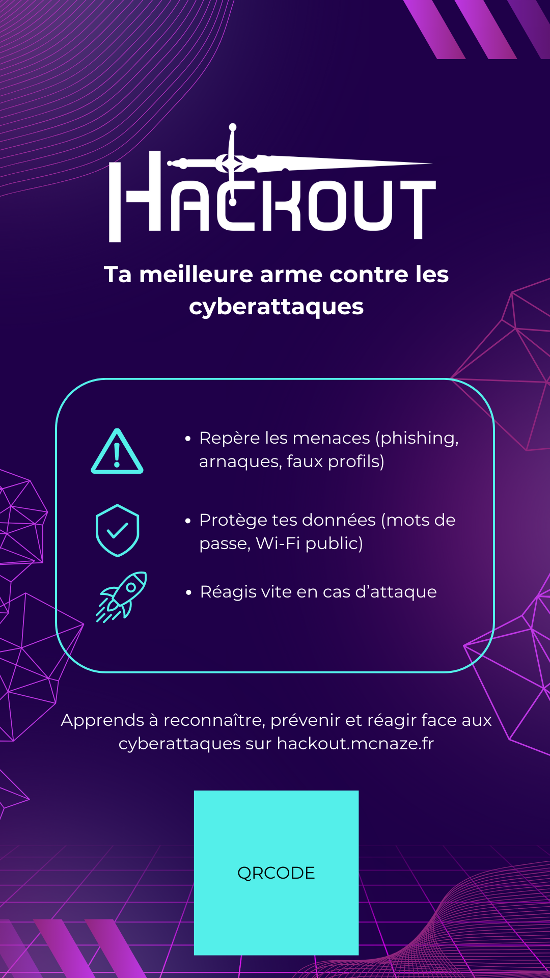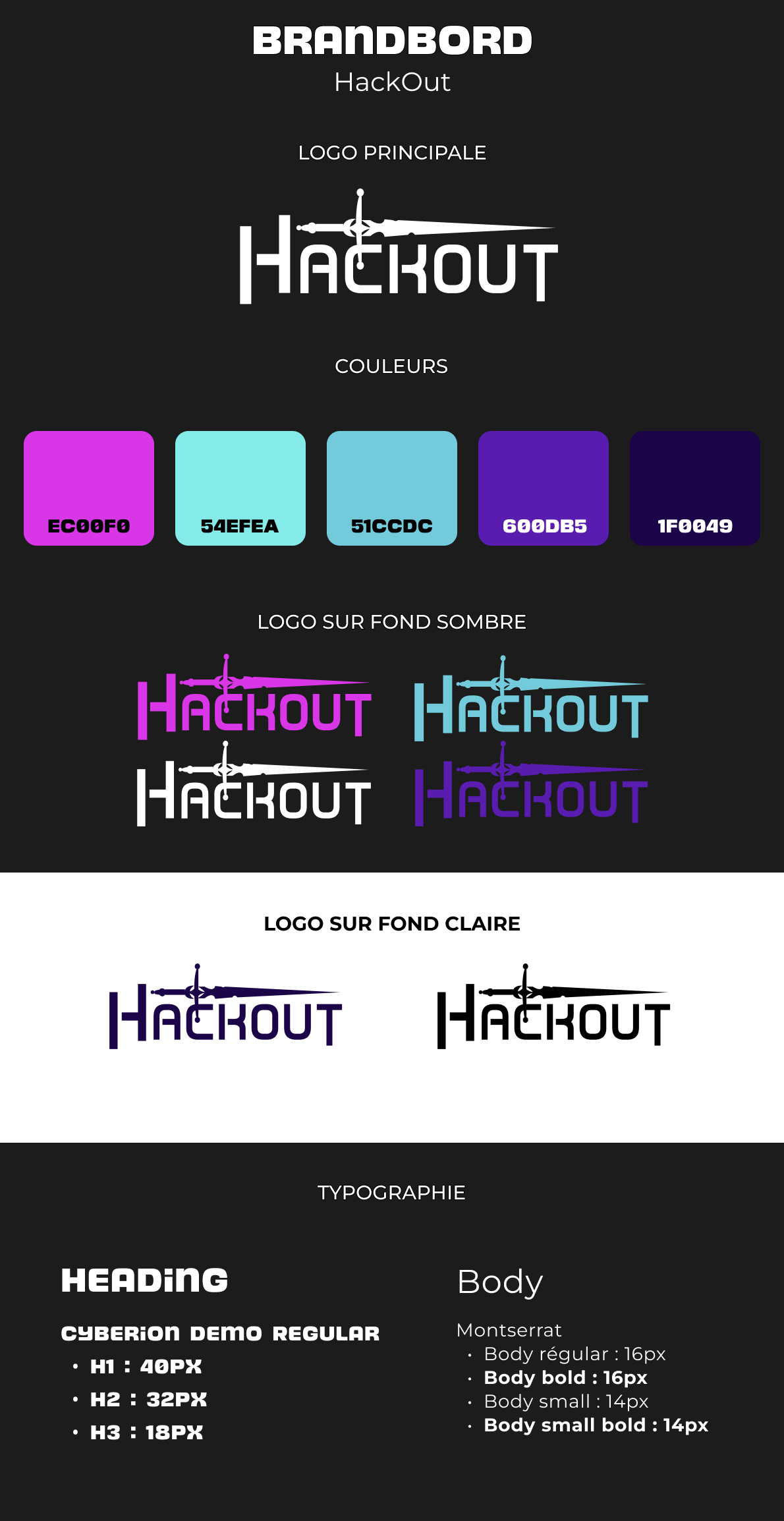 Lors de ma phase de recherche, je voulais trouver une image parlante pour mon projet. J’avais d’abord pensé à un bouclier, pour symboliser la protection contre les cyberattaques, mais je trouvais que cela ne représentait que l’aspect prévention du site, le « comment s’en protéger » alors que ce dernier explique aussi comment se défendre. J’ai alors pensé à une épée qui permet de se défendre et de « contre-attaquer ». Le rapprochement avec les épées légendaires comme Excalibur ou bien d’autre s’est fait naturellement : HackOut, en plus du nom du site, sera le nom de la cyber-épée qui permettra à ses utilisateurs se protéger des cyberattaques et de les contre-attaquer.